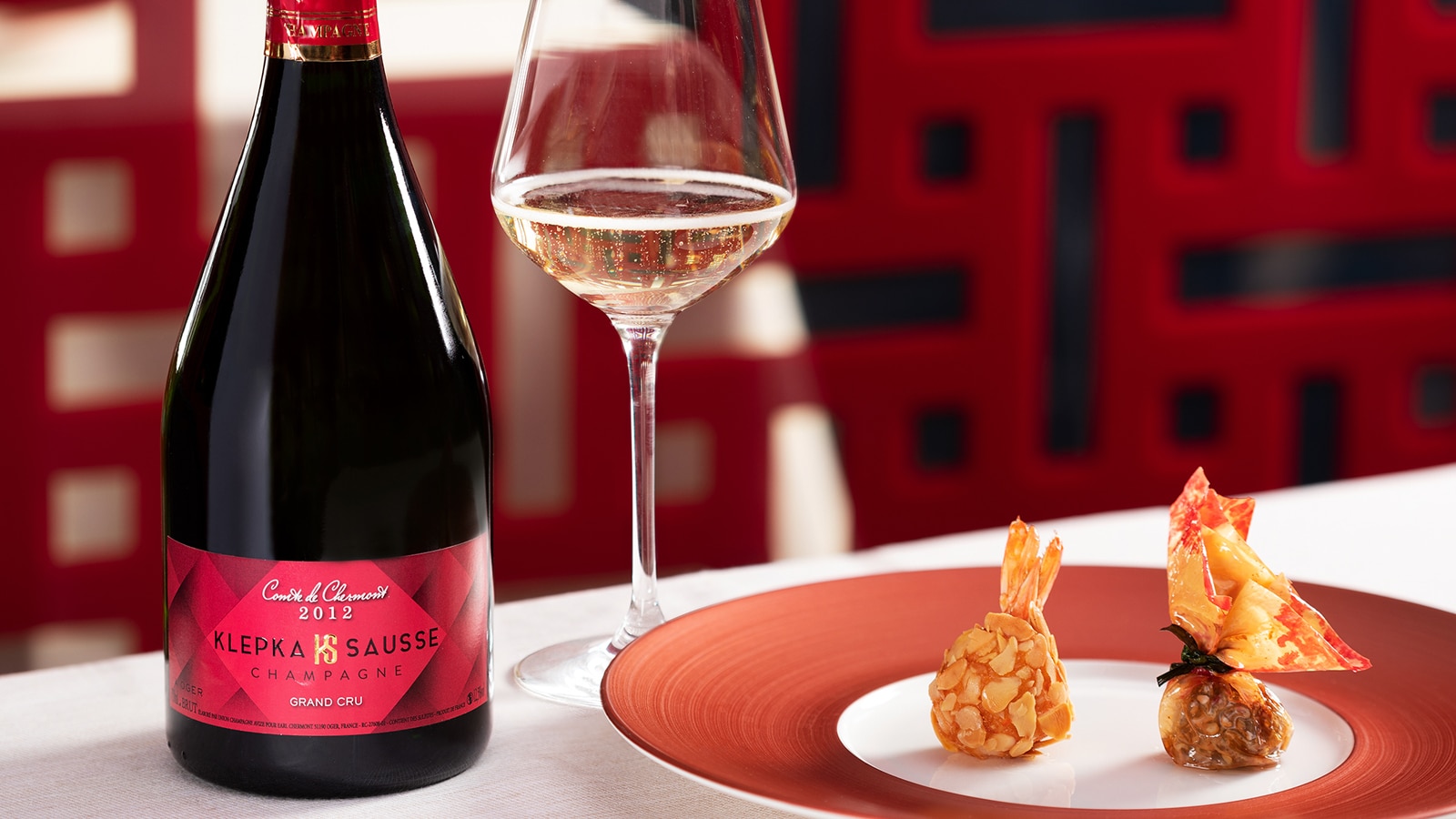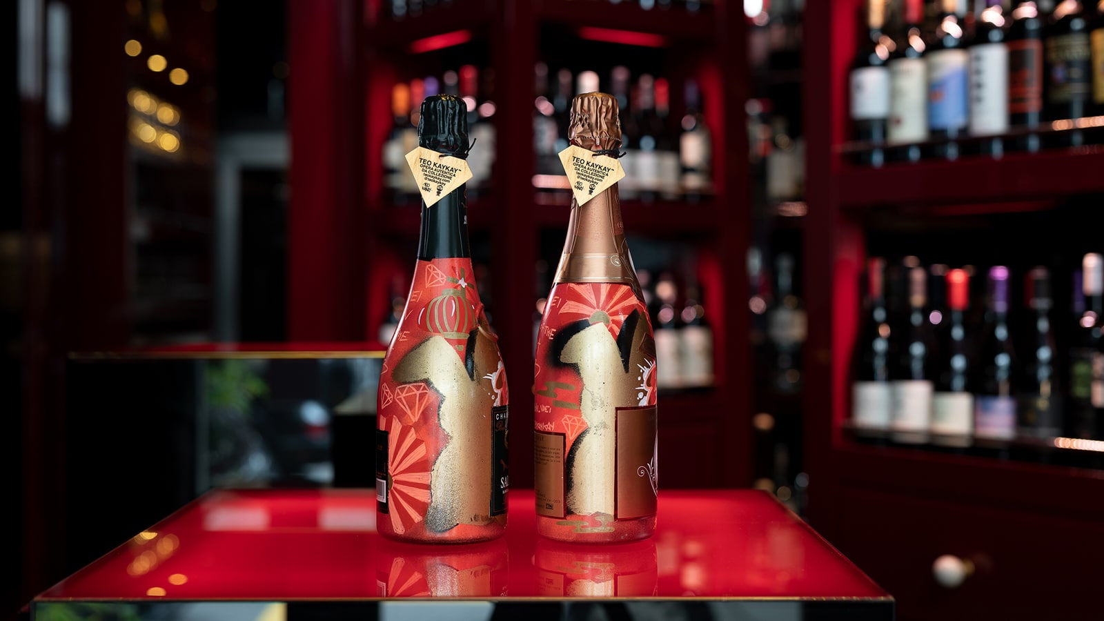 Durante la cena, oltre agli abbinamenti tra i vini del catalogo della nuova agenzia milanese Distribuendo Wine & Spirits e i piatti di chef Zhang, sono state presentate due bottiglie di champagne (un Salon Blanc de Blancs Le Mesnil – Brut 2012 e un Cristal Rosé 2009 Louis Roederer) personalizzate dallo street artist Teo Kaykay con il simbolo del coniglio, il suo ideogramma e il tag con cui firma le sue opere, il caratteristico diamante. Le bottiglie sono due pezzi unici: una è stata messa all’asta, mentre l’altra resterà nella collezione di Bon Wei.
