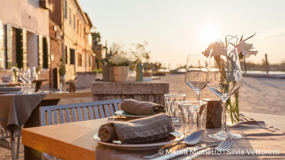 Non sono molte le proposte in carta, un segnale evidente di cura e attenzione, e sempre legate a ciò che mare e terra propri di questa zona offrono nei diversi momenti dell’anno. Sapori intensi per una mise en place elegante, cui si accompagna una carta dei vini, uve Dorona a parte, particolare e di qualità, che presenta soprattutto etichette locali e regionali per produttori, spesso, coraggiosi e controcorrente.